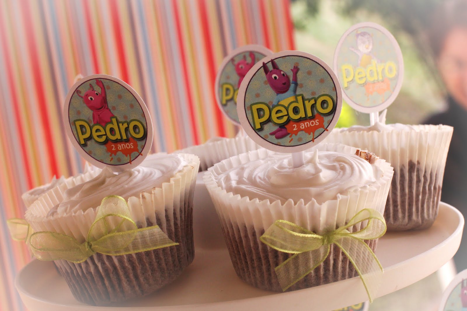 Cupcake amarrado no filó e com balãozinho nas cores dos personagens, feitos pela Silvana Correa